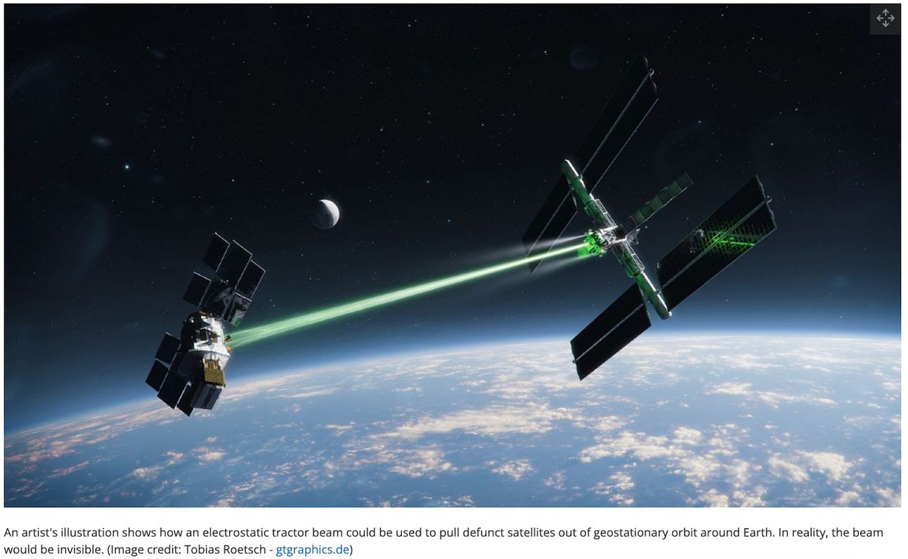How this all works gets pretty geeky, but basically you’d have a spacecraft with an electron gun that would fire negatively charged electrons at a dead target satellite which would make the target satellite have a negative charge. “The electrostatic attraction between the two would keep them locked together despite being separated by 65 to 100 feet (20 to 30 meters) of empty space.” according to the article. They would never actually touch, but the positive and negative fields would allow the spacecraft to pull the target to a desired orbit (told you it’d be pretty geeky!).