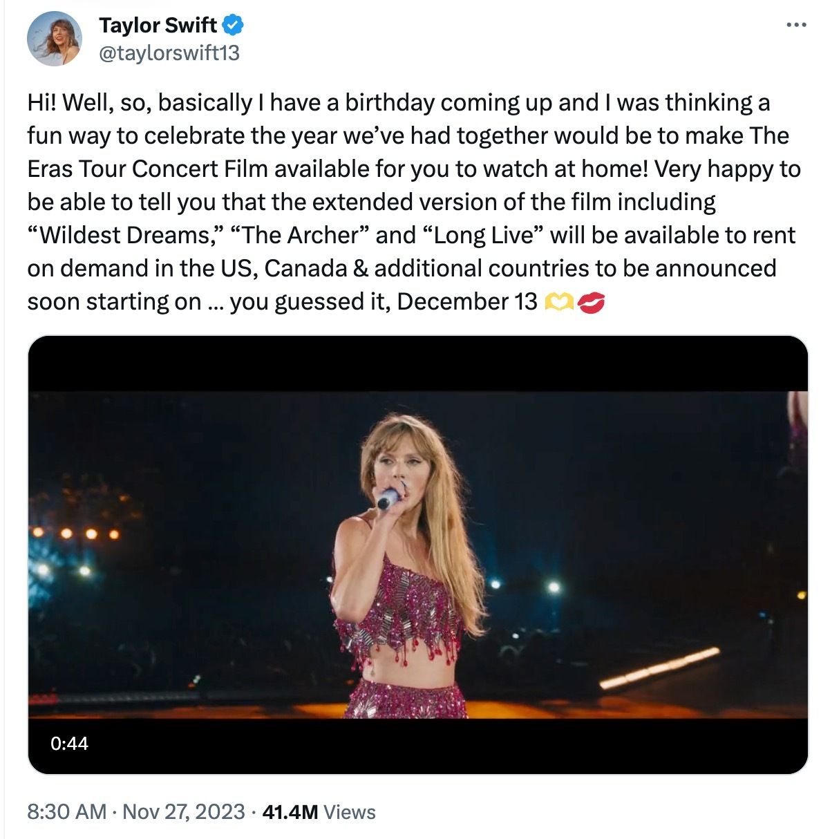“I was thinking a fun way to celebrate the year we’ve had together would be to make The Eras Tour Concert Film available for you to watch at home! Very happy to be able to tell you that the extended version of the film including ‘Wildest Dreams,’ ‘The Archer’ and ‘Long Live’ will be available to rent on demand in the US, Canada & additional countries to be announced soon starting on … you guessed it, December 13.”