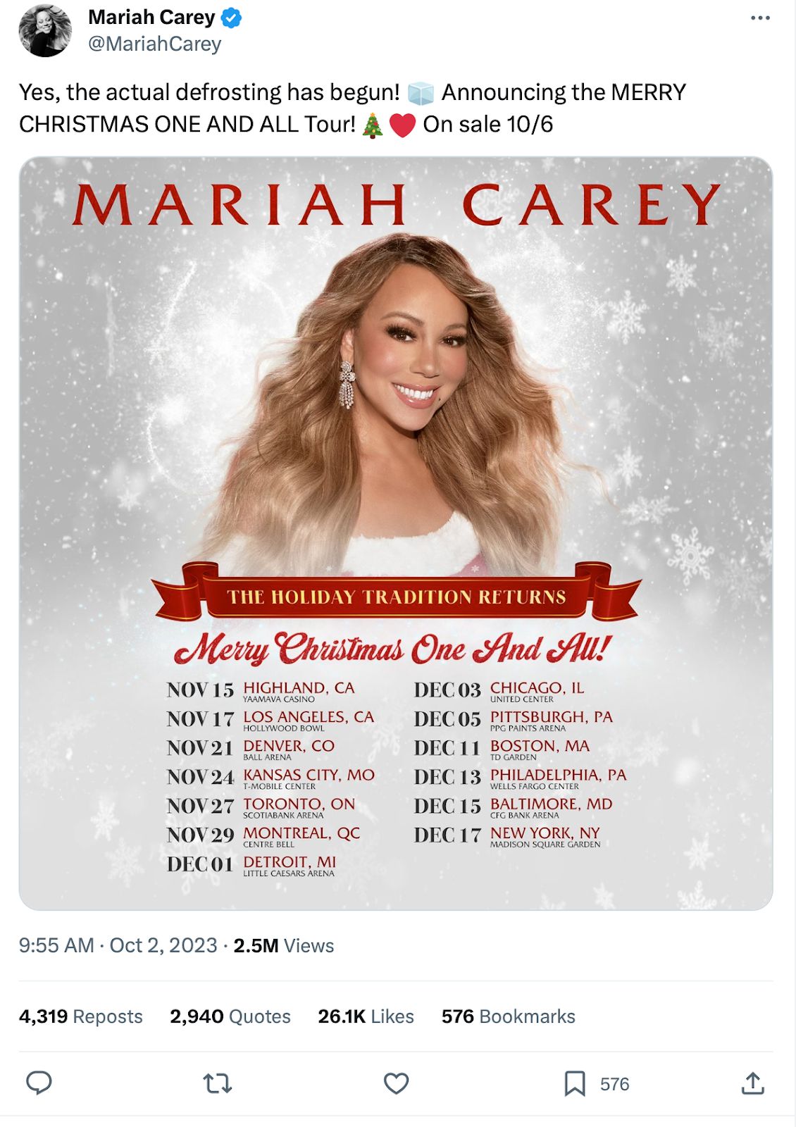 Mariah is back with a “Merry Christmas One And All Tour” that she announced on social media with tickets going on sale on 10/6.