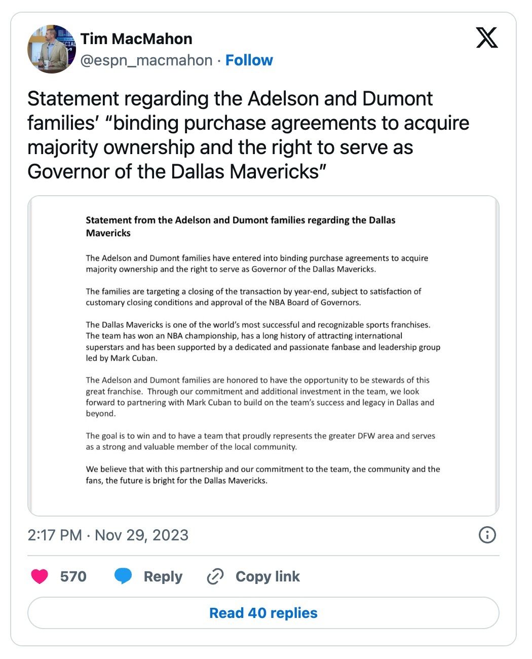 Mark Cuban has entered an agreement to sell a majority stake in the Dallas Mavericks to the Adelson and Dumont families, while still continuing to own a “significant share” of the basketball franchise and most important to Mark Cuban continue to have a say over the basketball operations side of the business.